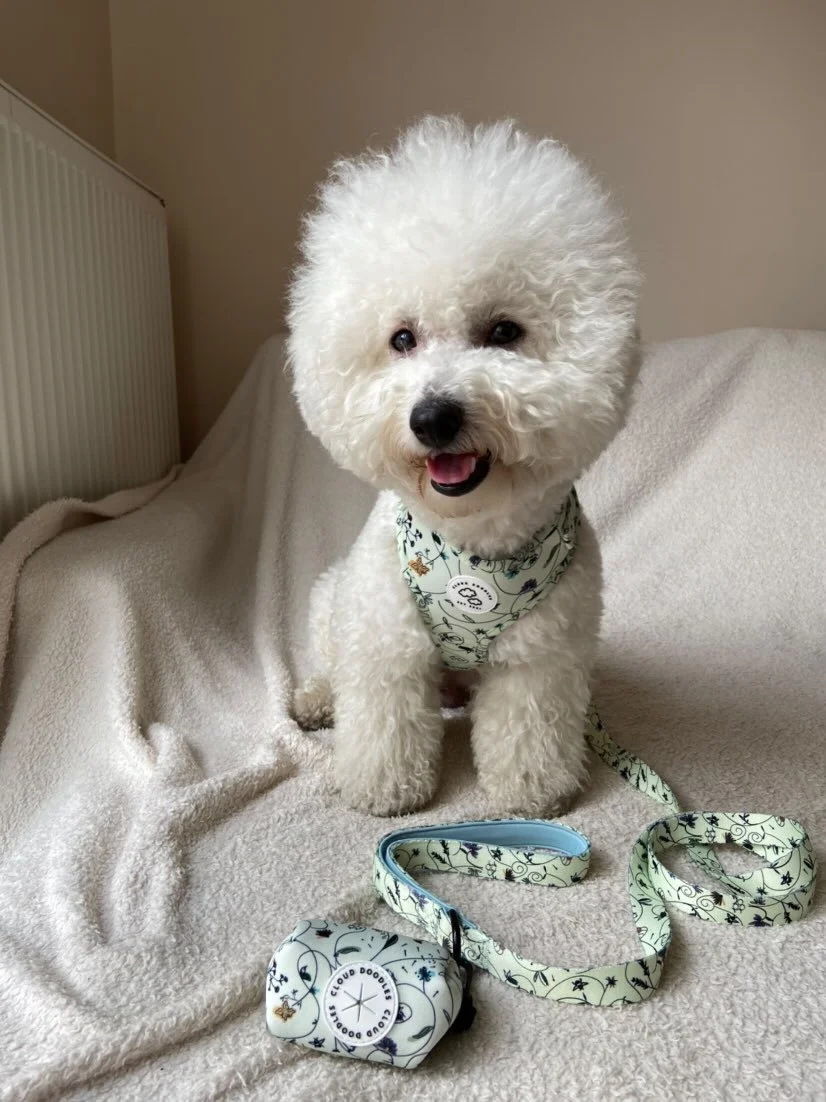 Get your harness, leash, and poop bag set as a bundle in your favorite Cloud Doodles patterns!